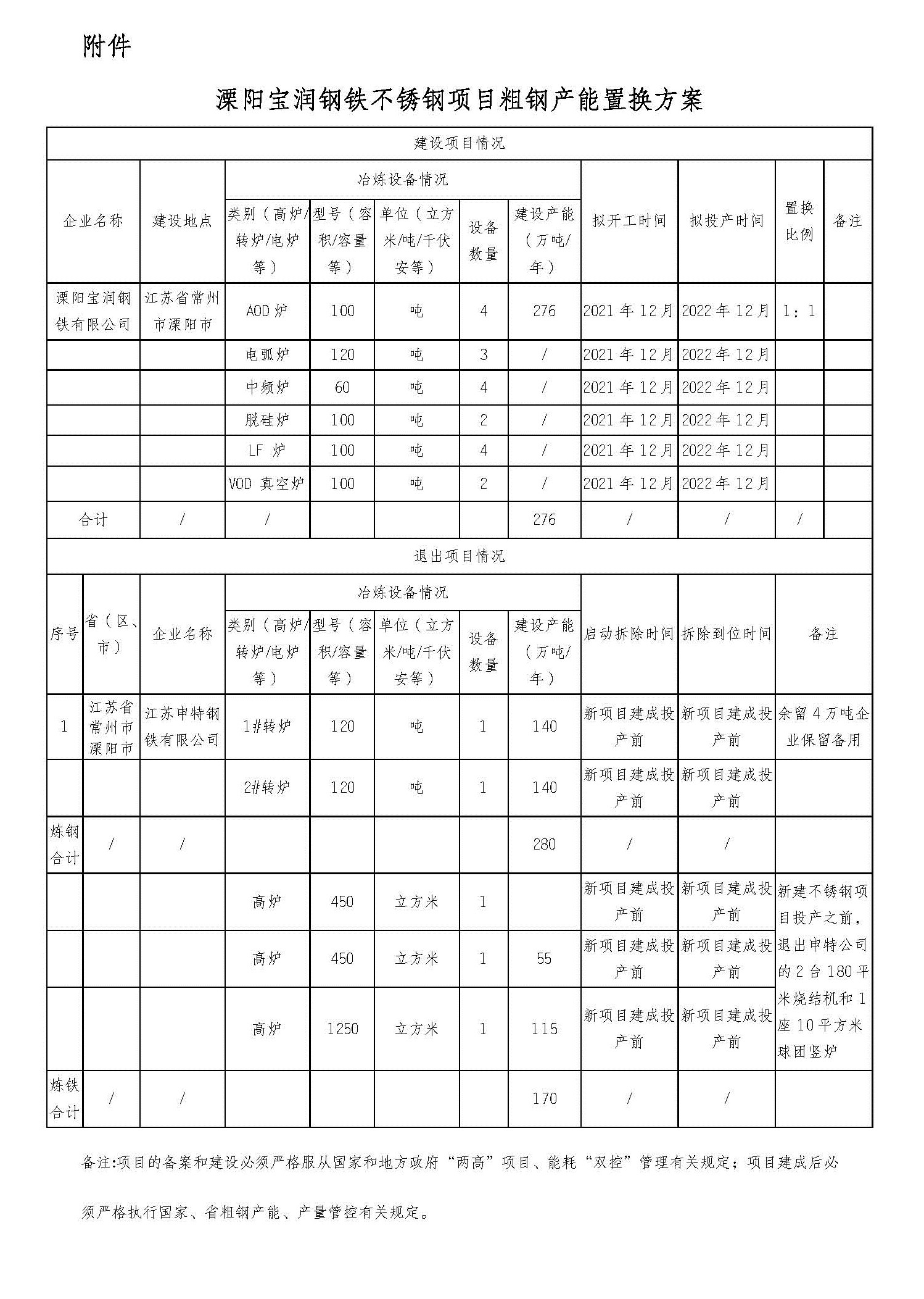 备注:项目的备案和建设必须严格服从国家和地方政府“两高”项目、能耗“双控”管理有关规定;项目建成后必须严格执行国家、省粗钢产能、产量管控有关规定。